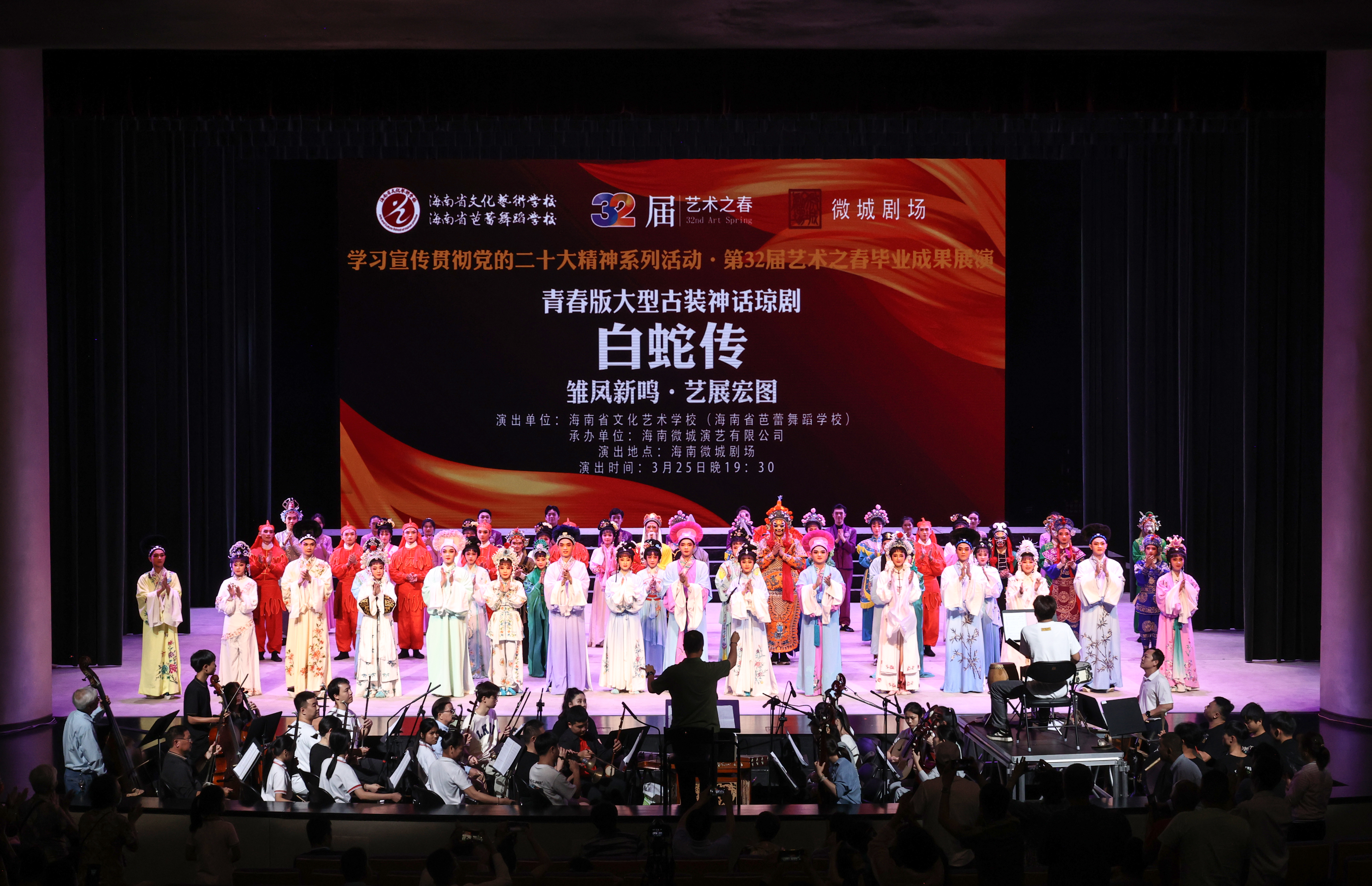 3月25日晚,由beat365琼剧表演专业毕业班级近百名师生带来的青春版琼剧《白蛇传》在微城剧场精彩上演。beat365校长莫青桥、副校长王枢出席,琼剧教研室部分师生及戏迷观众共同观看演出。