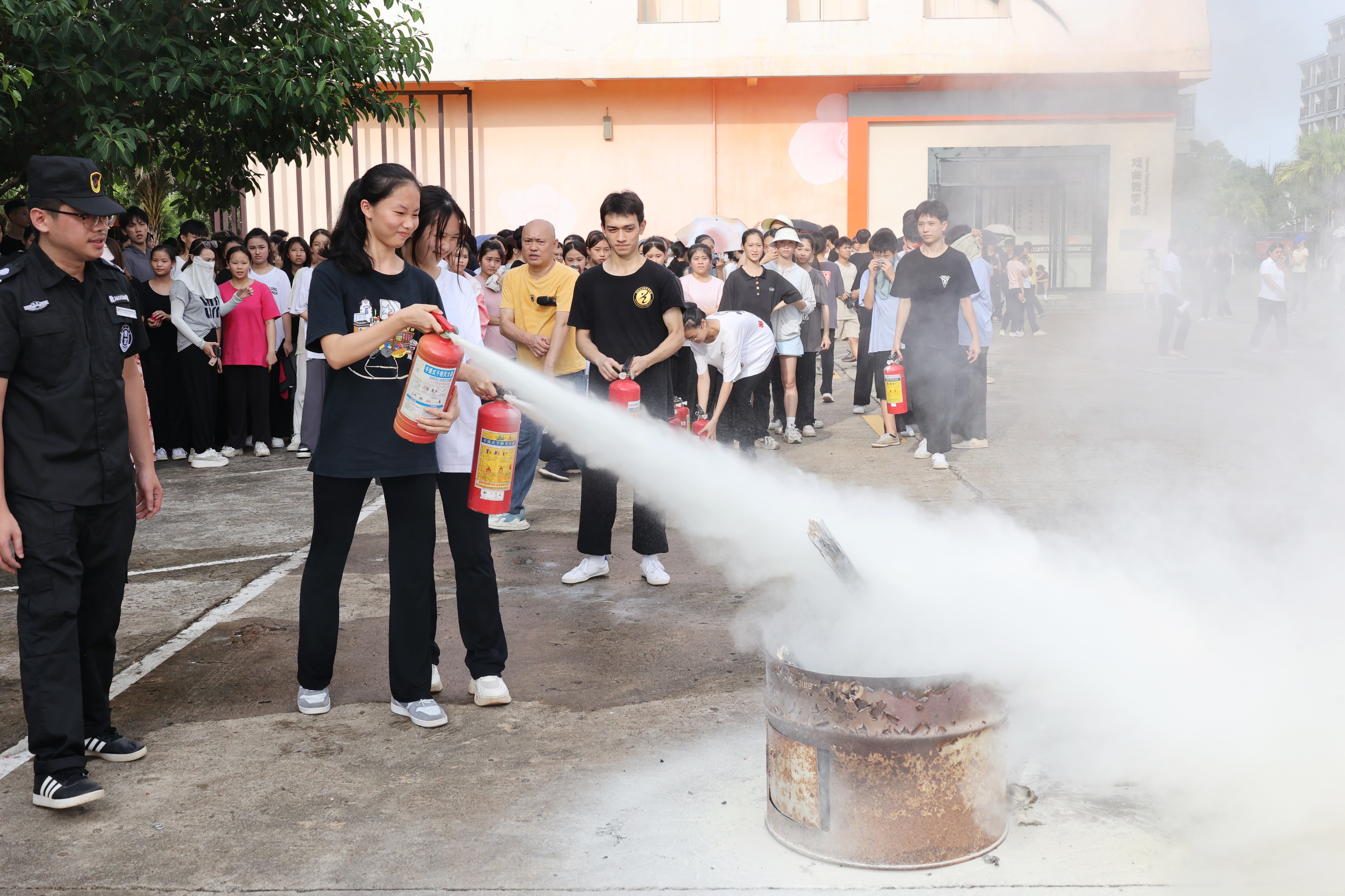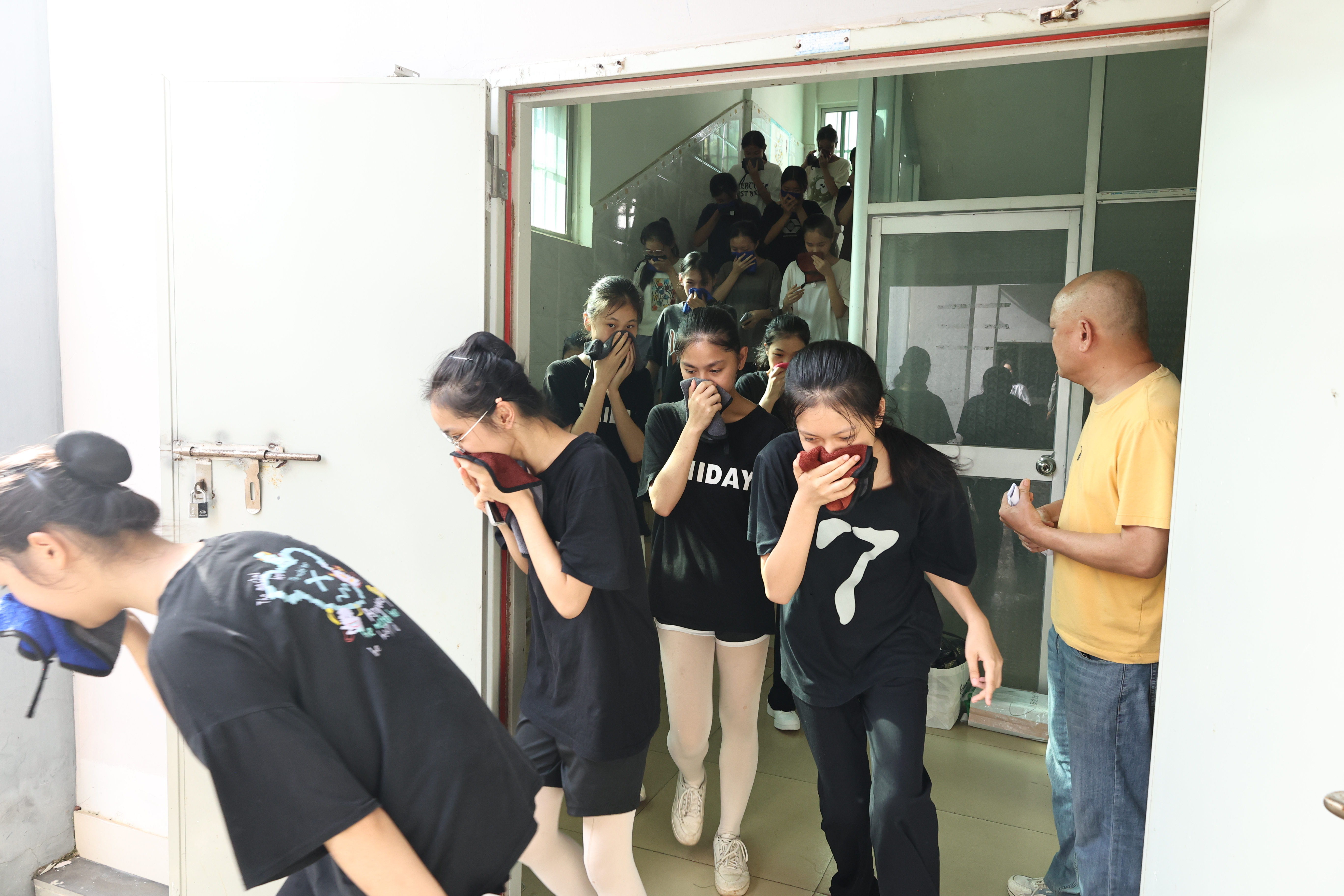 本次应急演练内容包括全体师生应急疏散演练和消防器材知识培训及现场演练两部分。应急疏散演练模拟真实火灾场景,随着警报声响起,全员从宿舍进行疏散。师生在指挥人员的引导下,用湿毛巾捂住口鼻,弯腰急速前行,就近从疏散通道快速下楼,有序疏散,到达指定位置集结。