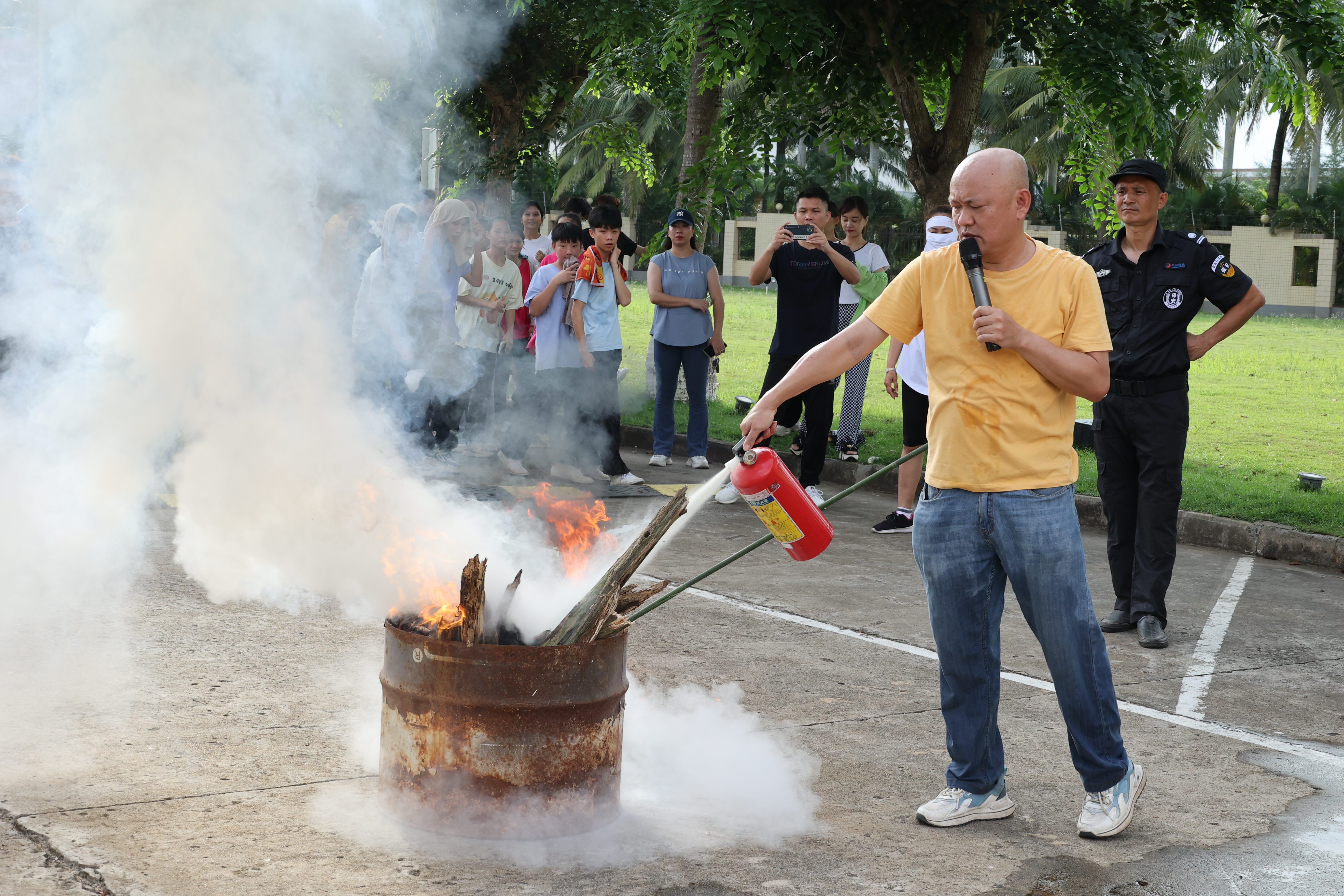 疏散演练完毕后,全体师生集合在草坪前进行现场“灭火”演练。首先由现场总指挥给师生们介绍灭火器的使用、煤气瓶着火的安全处理方法,并向师生演示如何正确灭火。师生通过培训后,手执灭火器“提、拔、握、压”进行“灭火”演练。