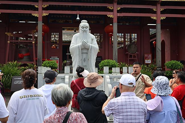 下午,退休干部职工们前往文昌孔庙参观。大家走进孔庙,仿佛穿越时空,回到了那个文风昌盛的时代。他们参观了庙宇的各个院落,欣赏了古朴庄重的建筑风格和精美的雕刻艺术。在这里,退休干部职工们瞻仰万世师表的雕像,聆听讲解员讲述孔子的故事和思想,深刻感受到了教育的重要性和文化的传承力量。