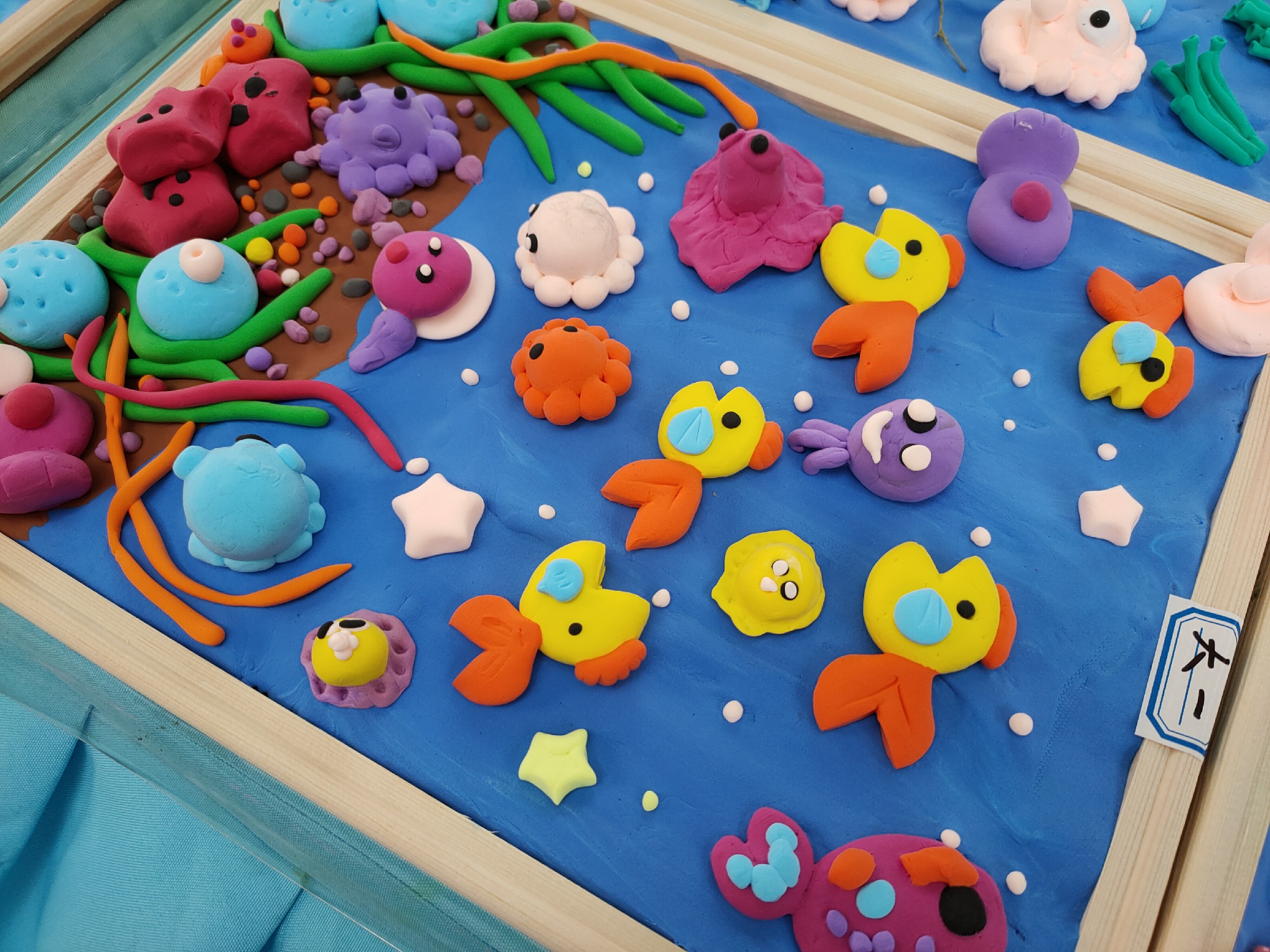 活动现场,神奇的彩泥变幻,唤起孩子们动手的兴趣,大家迫不及待地在老师的指引下,发挥丰富的想象,手中上下飞舞,一幅幅生动的手工作品顺利“完工”。孩子们在课堂上体验到从生活感知转变为艺术创作这一过程,并在互动体验、动手创作中深入理解海洋文化的无穷奥秘。