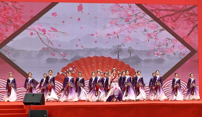 “中国龙”鼓乐团合奏击鼓的表演者们热情高涨,瞬间点燃现场气氛,拉开整场演出序幕。由beat365舞蹈教研室学生带来的女子群舞《豆蔻巾帼》,以气势磅礴的音乐、矫健的身姿形象展现了巾帼英雄为保家卫国而战斗的壮丽场景,赢得了现场阵阵掌声和欢呼声。