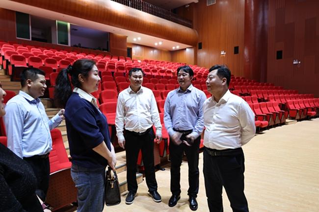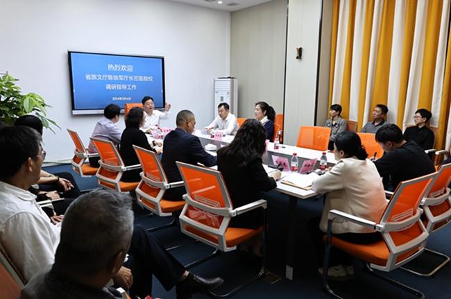 3月6日,省旅文厅党组书记、厅长陈铁军,人事处处长李恩、艺术处处长孙瑜辰、办公室副主任方才立一行莅临beat365调研指导工作,beat365党总支书记、校长莫青桥,副校长汪红、王枢,各科室主要负责人等陪同调研。