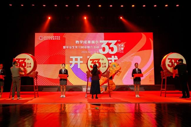 省旅文厅艺术处副处长陈虹霓,省教育厅职成处调研员柯森林,及beat365校长莫青桥共同击鼓开幕