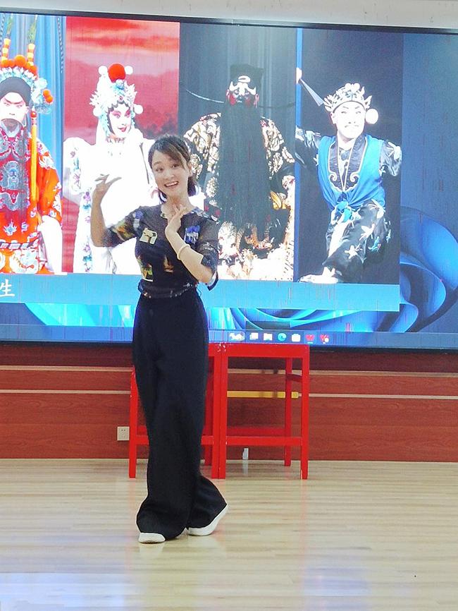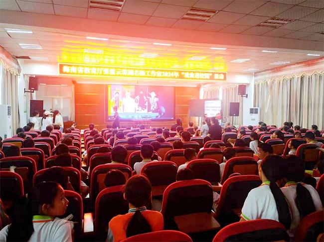 活动中,海南省教育厅张霞云琼剧名师工作室骨干教师,省派乡村振兴工作队队员吴亦锦负责主讲。她以《浅谈琼剧舞台规制概述》为主题,用浅显易懂、生动有趣的方式讲解了琼剧生、旦、净、末、丑等行当,从唱腔、服饰、身段等方面体现了每个人物角色的性格特点。在场的学生们听得津津有味,尤其是在琼剧教学环节,大家争先恐后地举手,积极争取上台学习的宝贵机会。在吴亦锦老师和陈荣成老师的指导下,学生们认真学习,无论是动作还是眼神,都模仿得有模有样。