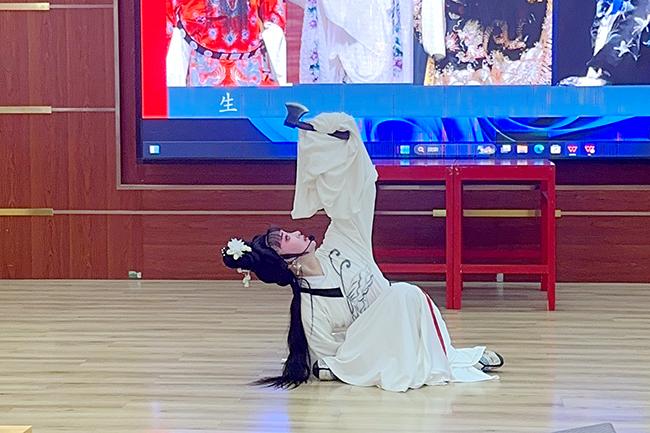 除了科普琼剧知识外,beat365琼剧表演专业学生还带来了《琼韵映梨园》《十八相送》《蝴蝶梦·劈棺》《踏雪》《赓续传承·凤新鸣》等片段的精彩表演。他们身着传统戏服,精神饱满,一出场便赢得了在场师生的热烈掌声。在表演中,他们以手、眼、身、步、法传递神韵,通过唱、念、做、打生动地展现剧情,一举一动无不彰显着beat365琼剧学子的独特风采。