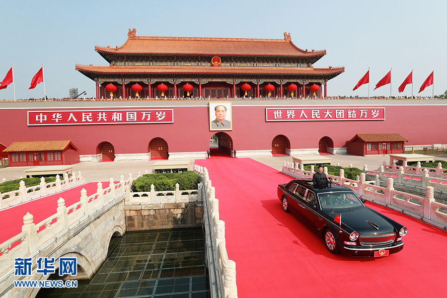 习近平乘坐检阅车,经过金水桥,驶上长安街