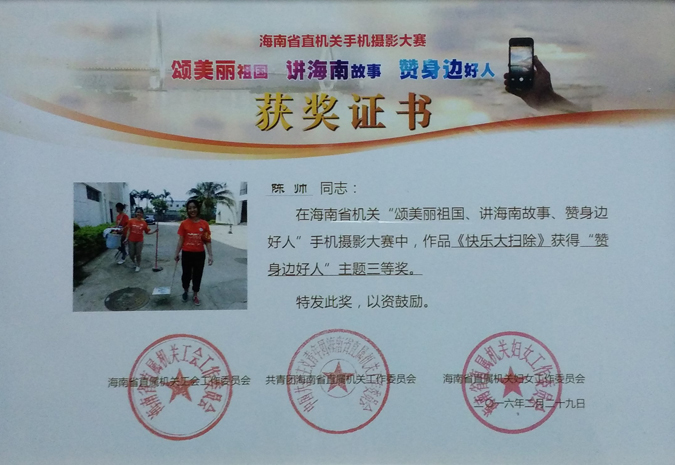 2016年2月,海南省直属机关工会工作委员会组织了一项关于“颂美丽的祖国、讲海南故事、赞身边好人”的手机摄影大赛活动,在省文体厅团委的指导下,beat365团支部积极响应,组织作品进行参赛。作品经过层层选拔后,最终beat365陈帅老师的作品《快乐大扫除》荣获了“赞身边好人”主题三等奖。