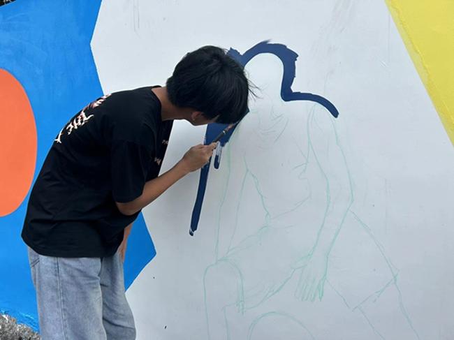 墙绘活动现场,师生们齐心协力、分工合作,确立了先使用铅笔勾勒大致线条,再通过颜料进行上色的方法,绘制内容以体育动力、文化娱乐为主题。画笔起落间,一幅幅色彩斑斓、创意十足的墙绘让老旧的白墙和水泥看台“活”了起来,成为靓丽的风景线,洋溢着浓郁的艺术气息。