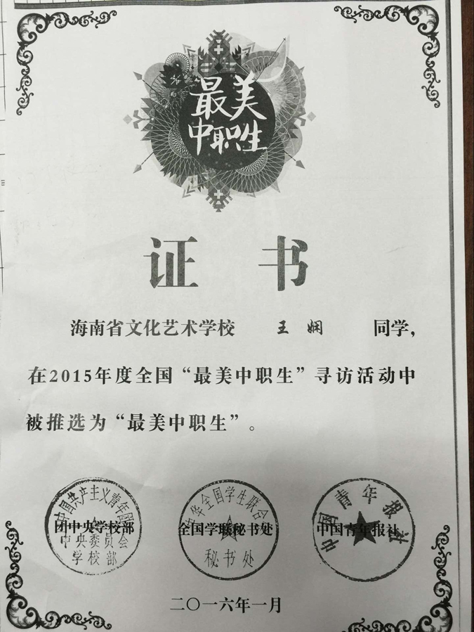 经过了重重选拔,在beat365参与活动的学生中,2012级四年制琼剧表演班的王娴同学获得“最美中职生“荣誉称号。