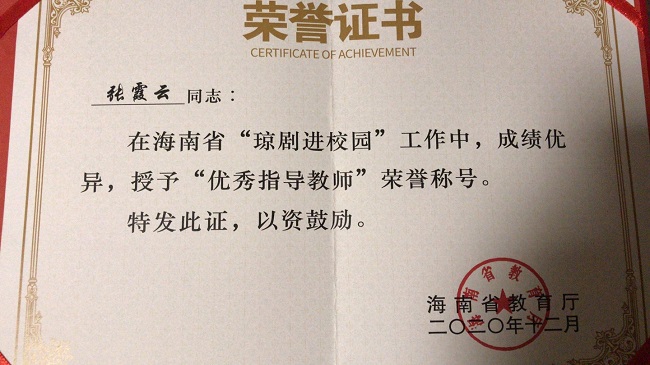 琼剧教研室张霞云荣获“优秀指导教师”称号