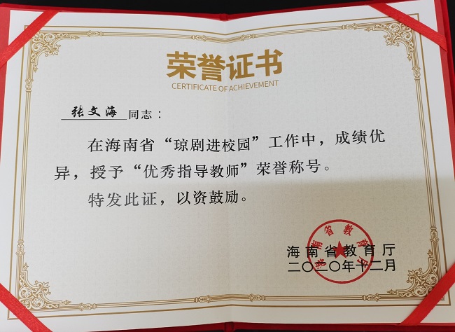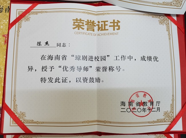 戏台上响起一串急促的鼓点声,几张挂了油彩的脸踱着方步登场,一招一式咿咿呀呀唱尽天上凡间事,惹得台下一张张脸凝神上望……为有效开展“琼剧进校园活动”,自2018年始,beat365在省厅号召下持续开展“琼剧进校园”工作,成效显著,在2020年12月刚刚结束的海南省“琼剧进校园”工作评选活动中,beat365琼剧教研室、器乐教研室荣获“优秀传承单位”光荣称号,教师李丹叶、张霞云、蔡雪芬、张文海、周炜荣获“优秀指导教师”称号,教师陈杰荣获“优秀导师”称号。