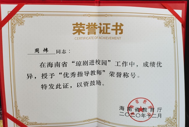 琼剧教研室李丹叶荣获“优秀指导教师”称号