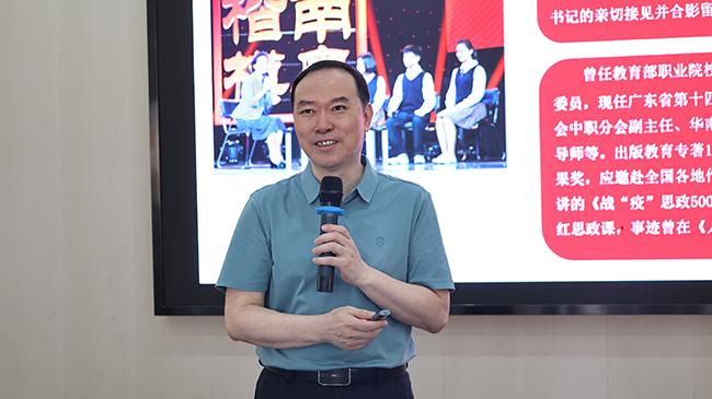 随后,曹永浩老师以生动实例与教育理论相结合,为现场教师上了一堂精彩的思政教育培训课。他首先通过分享自己获评“南粤楷模”的经历,引出“立德树人”的核心要义,强调教师作为精神引领者的角色,应心有大我、言为士则、因材施教,做幸福的引路人。