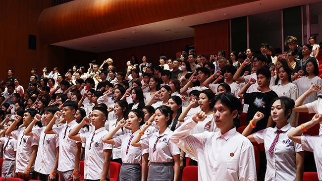 团委副书记邓元景带领全体毕业生面向国旗进行成人宣誓